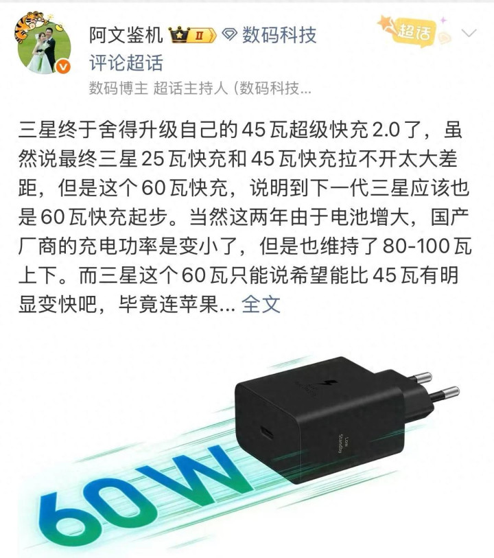 博主@阿文鉴机 表示,“虽然说最终三星25瓦快充和45瓦快充拉不开太大差距,但是这个60瓦快充,说明到下一代三星应该也是60瓦快充起步”。